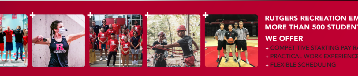 Rutgers Recreation employs more than 500 students. We offer a competitive starting pay-rate, practical work experience, and flexible scheduling. Recreation employees meet new people, develop transferable skills and feel good about helping to build a healthy Rutgers Community. Follow us to receive notifications when positions are posted and apply using the external link.